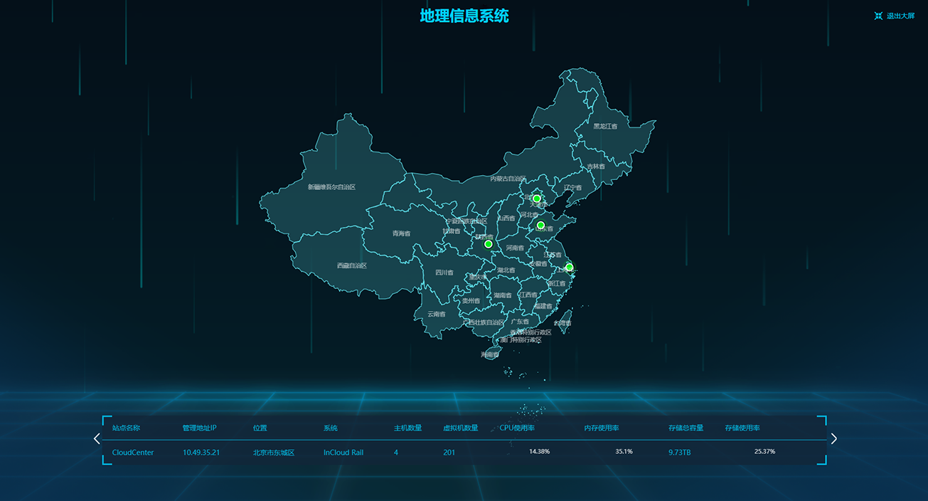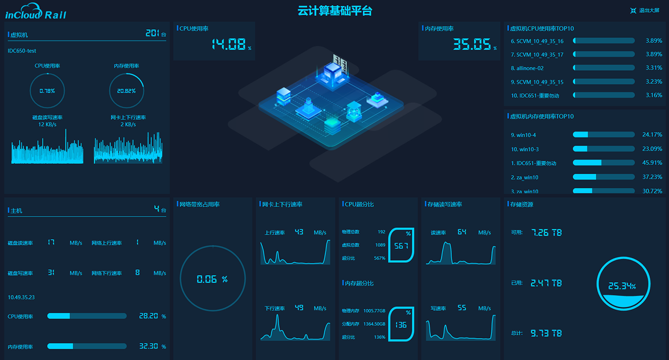 采用自主研发、基于 KVM 深度定制的计算虚拟化软件 InCloud Sphere,支持资源预留、热添加、GPU 直通、vGPU、USB Over IP、 DRS、DRX、裸机管理、虚拟录影机、磁盘双活等多种高级特性